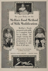 This is an original 1920 black and white print ad for the Mellin's Food Method of Milk Modification from the Mellin's Food Company, Boston. The ad has images of four adorable babies including: Wm. H. Newsome, Jr. of Huntington, West Virginia; Guy Bachand of Sherbrooke, Quebec; Manuel R. Rogers of San Luis Obispo, California; and Melbourne Barnaby of Hastings, Michigan.