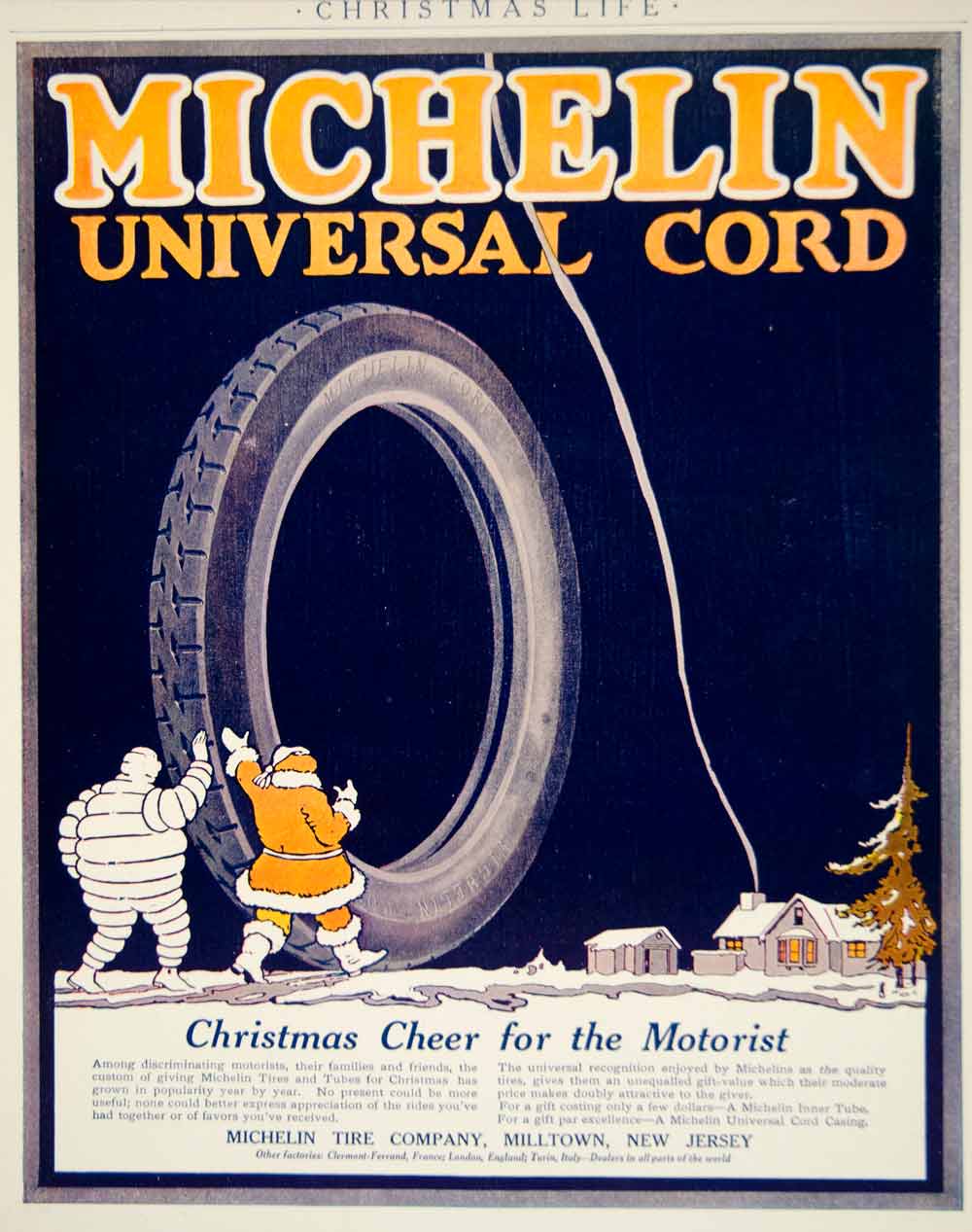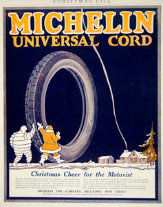 This is an original 1920 color print ad for Universal Cord automobile tires that were made and sold by the Michelin Tire Company of Milltown, New Jersey (NJ) during the Roaring Twenties era.