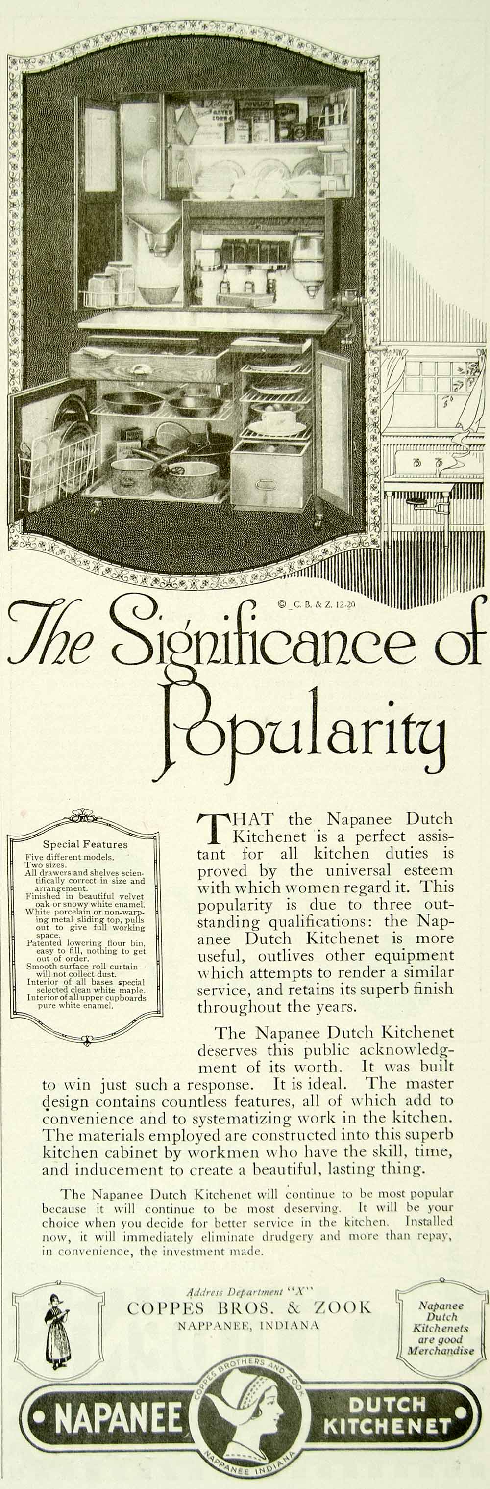 This is an original 1920 black and white print ad for Napanee Dutch Kitchenets, from Coppes Bros. & Zook in Indiana.