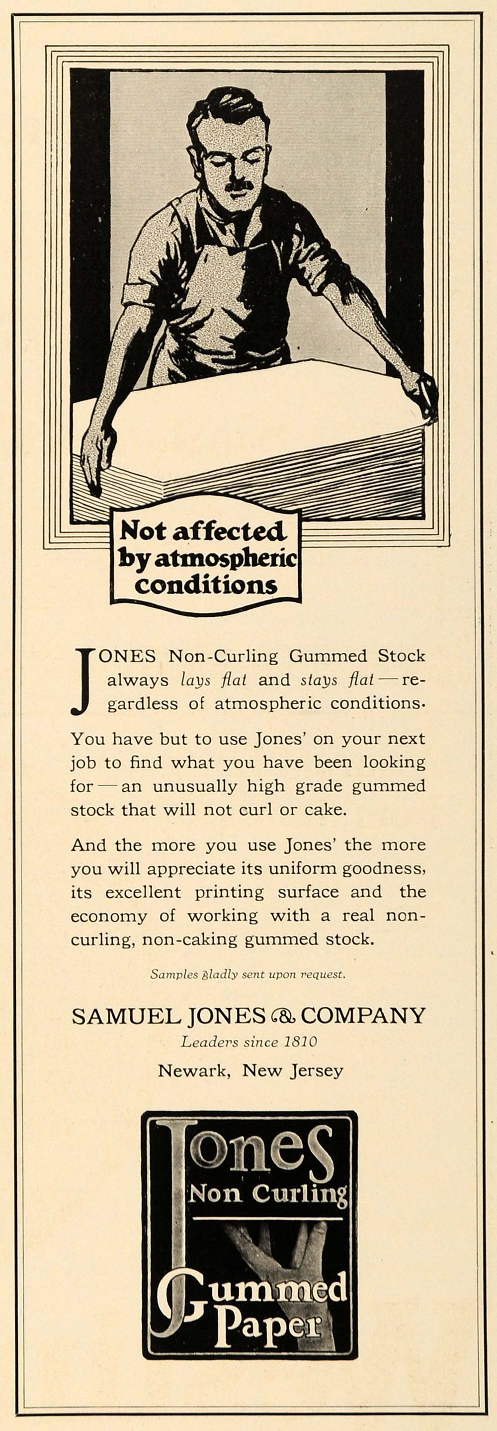 This is an original 1920 black and white print ad for Jones Non Curling Gummed Paper from the Samuel Jones & Co. located in Newark, New Jersey.