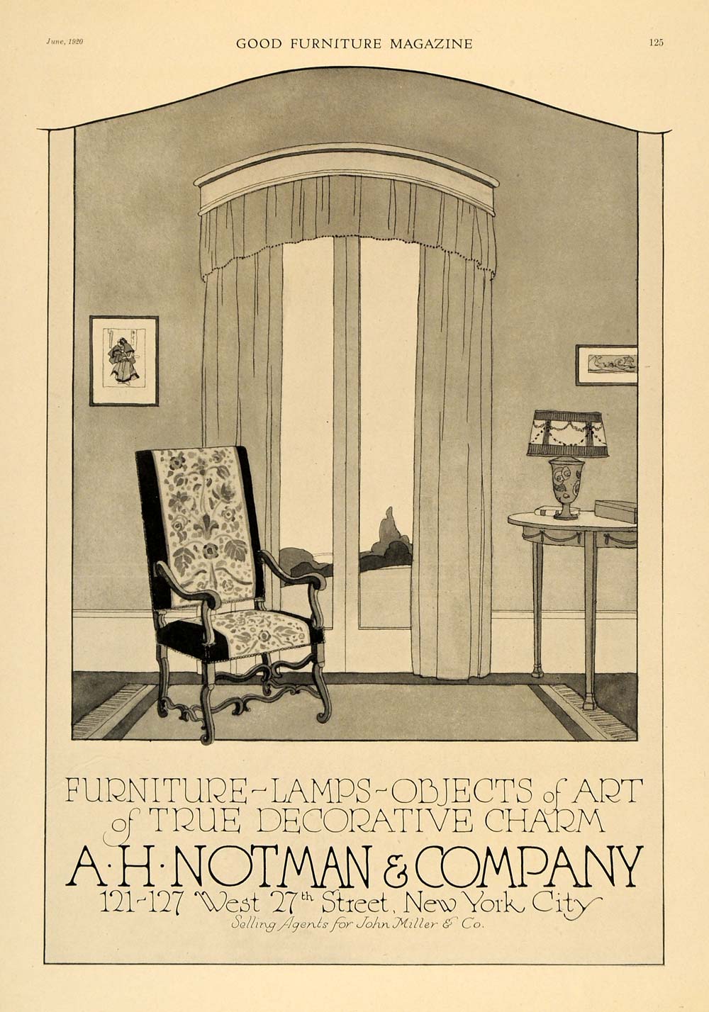 This is an excellent original 1920 black and white print ad promoting furniture, lamps, objects of art from A. H. Notman & Company located at 121-127 West 27th Street, New York City.