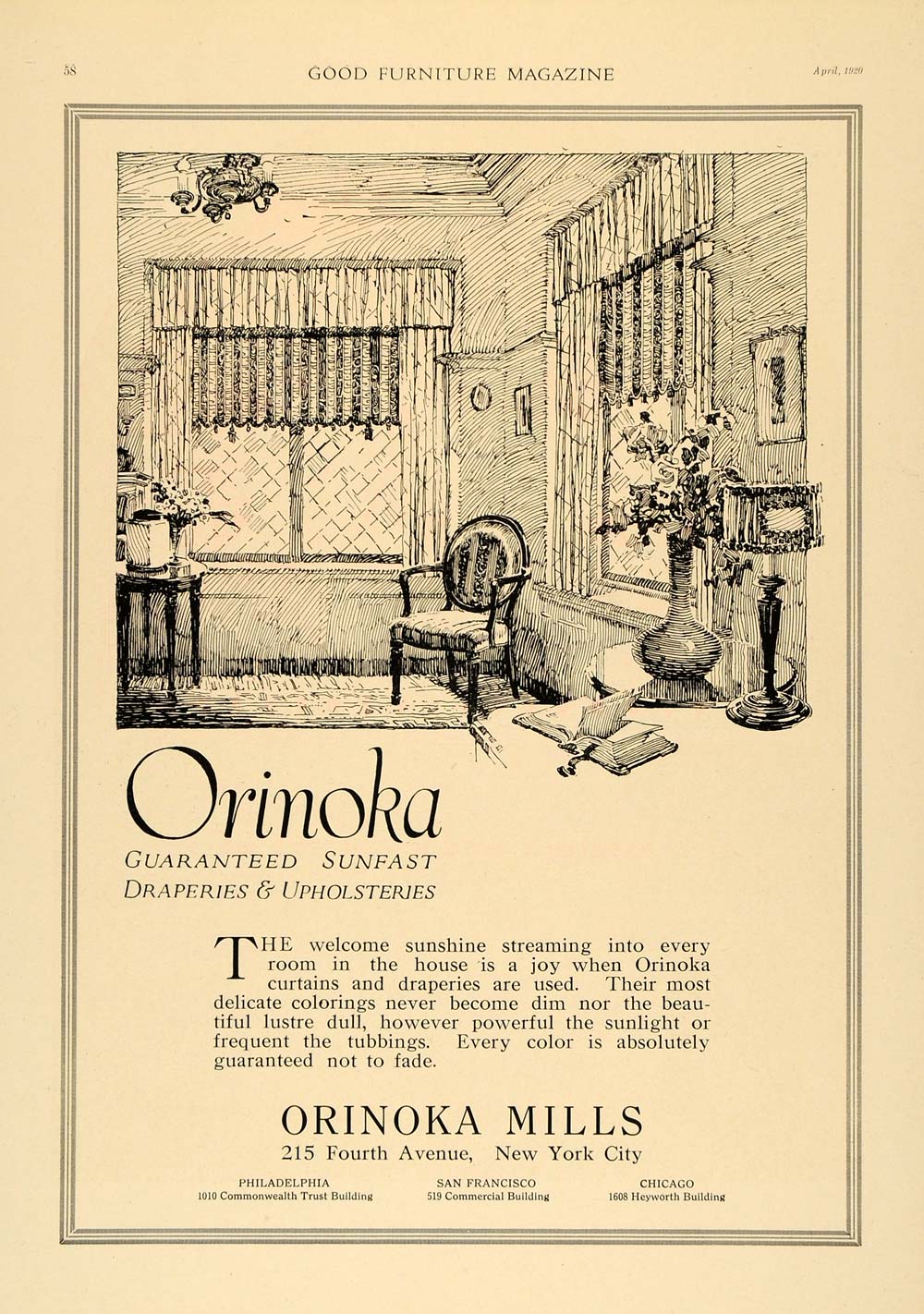 This is an original 1920 black and white print ad for the Orinoka Draperies & Upholsteries from Orinoka Mills located at 215 Fourth Avenue, New York City, New York.