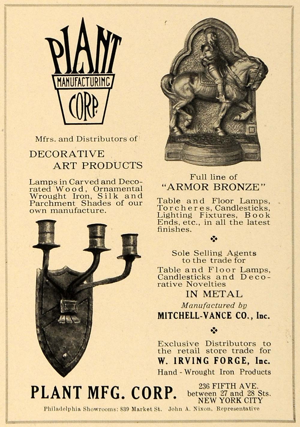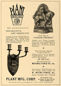 This is an original 1920 black and white print ad for the Plant Mfg Corp., Manufacturers and Distributors of Decorative Art Products, Lamps, Torcheres, Candlesticks and more.