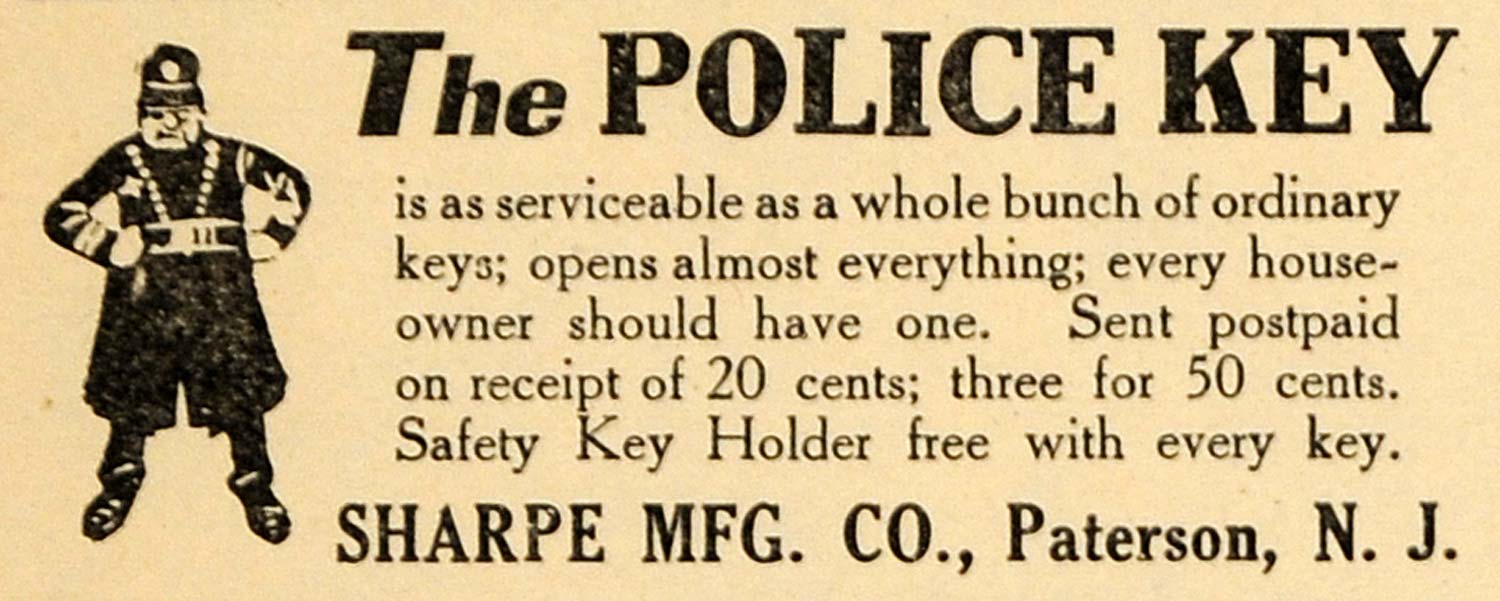 This is an original 1920 black and white print ad for the Sharpe Manufacturing Company, located in Paterson, New Jersey. This ad features their Police Keys that open almost every lock. This seems only slightly illegal.