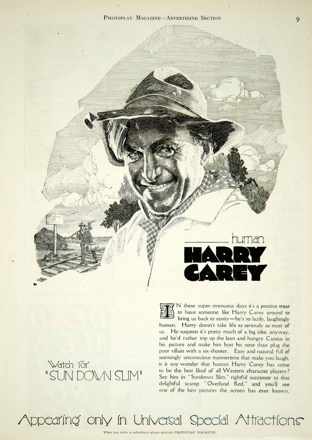 This is an original 1920 black and white print ad for silent film westerns from Universal starring the famous star, Harry Carey, including "Sundown Slim," and "Overland Red."