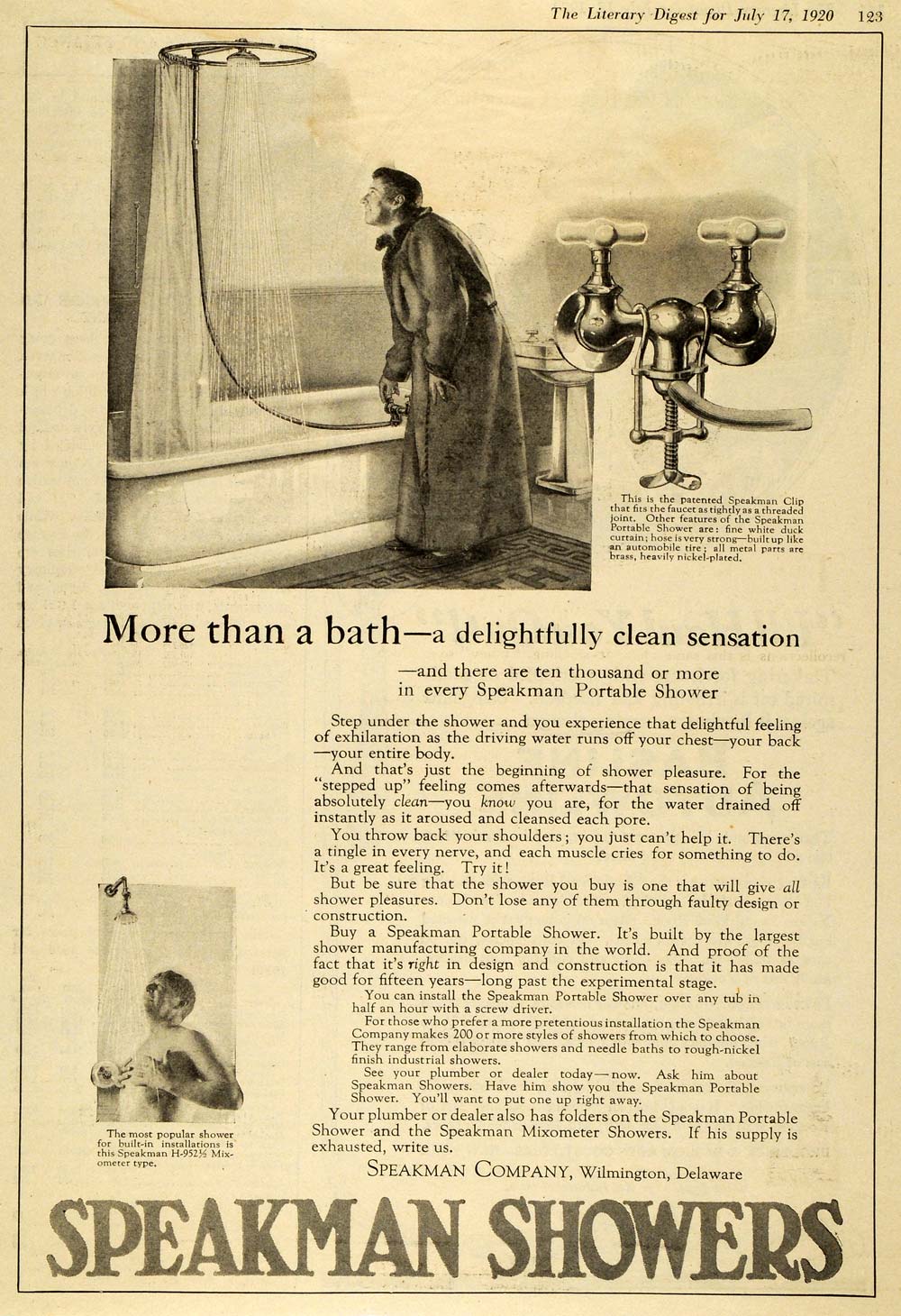 This is an original 1920 black and white print ad for the Speakman Portable Shower from Speakman Company located in Wilmington, Delaware.