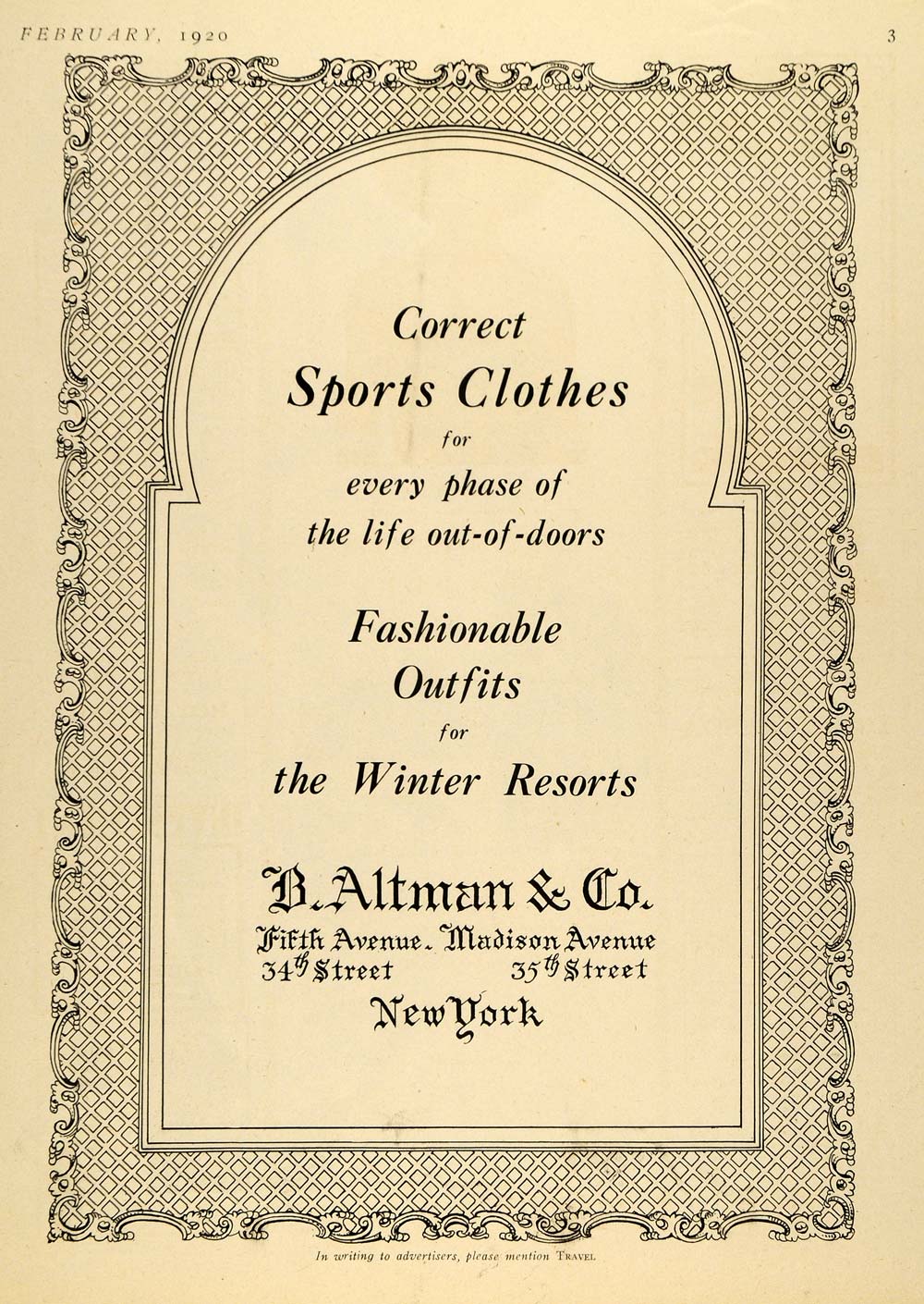 This is an original 1920 black and white print ad for correct sports clothes and fashionable outfits for the winter resorts by B. Altman & Company. They are located at Fifth Avenue, Madison Avenue, 34th Street and 35th Street in New York City.
