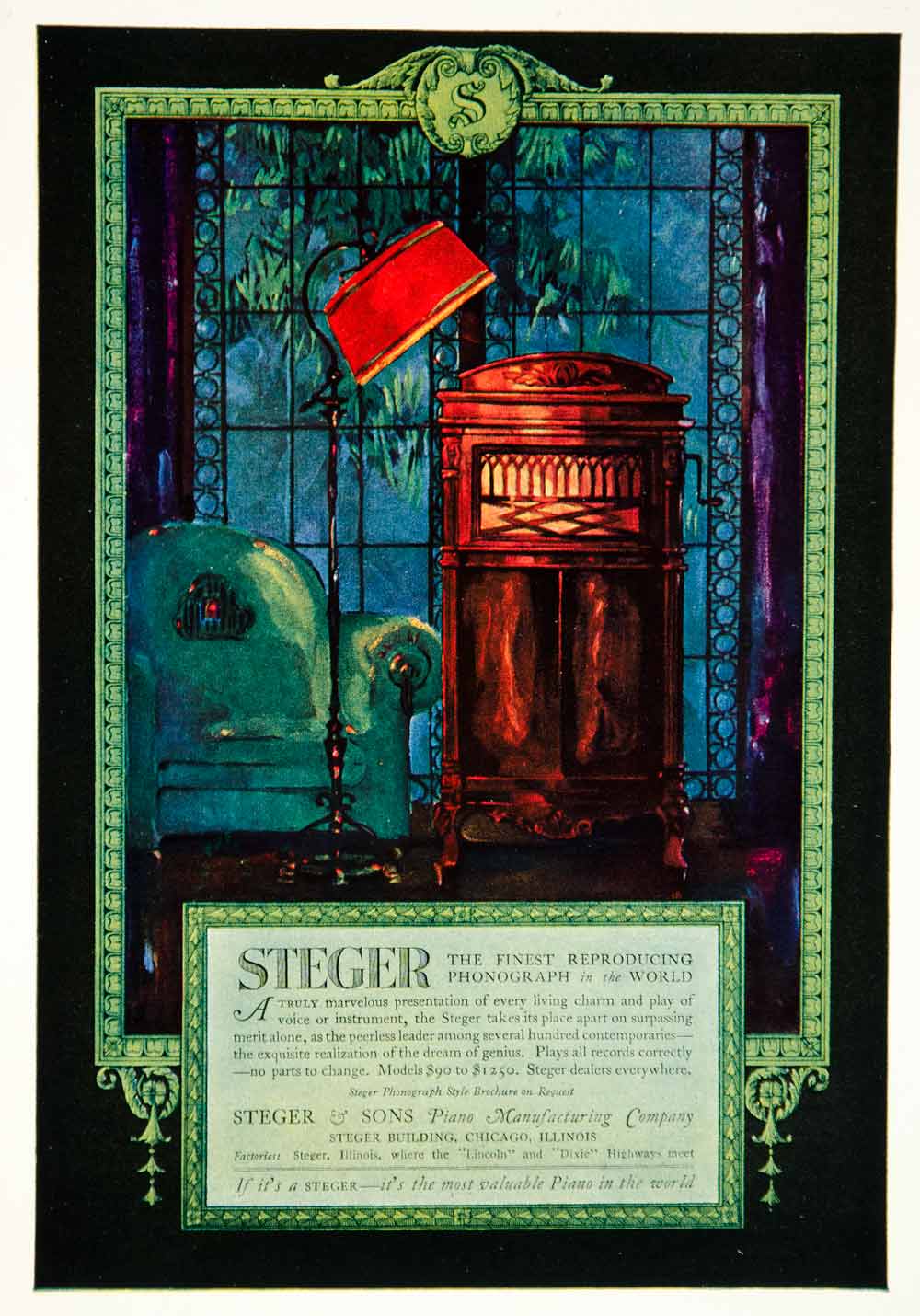 This is an original 1920 color print ad for the Steger & Sons Piano Manufacturing Company, featuring the Steger Phonograph, which is apparently the finest in the world.