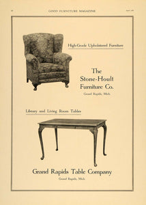 This is an original 1920 black and white print ad for high-grade upholstered furniture, library and living room tables by The Stone-Hoult Furniture Company and Grand Rapids Table Company located in Grand Rapids, Michigan.