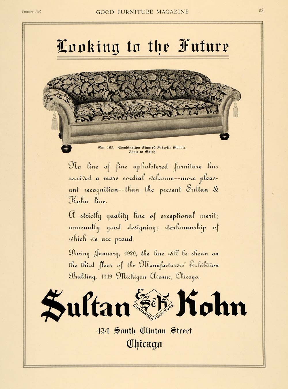 This is an original 1920 black and white print ad for Sultan & Kohn, a furniture company located at 424 South Clinton Street in Chicago, Illinois.