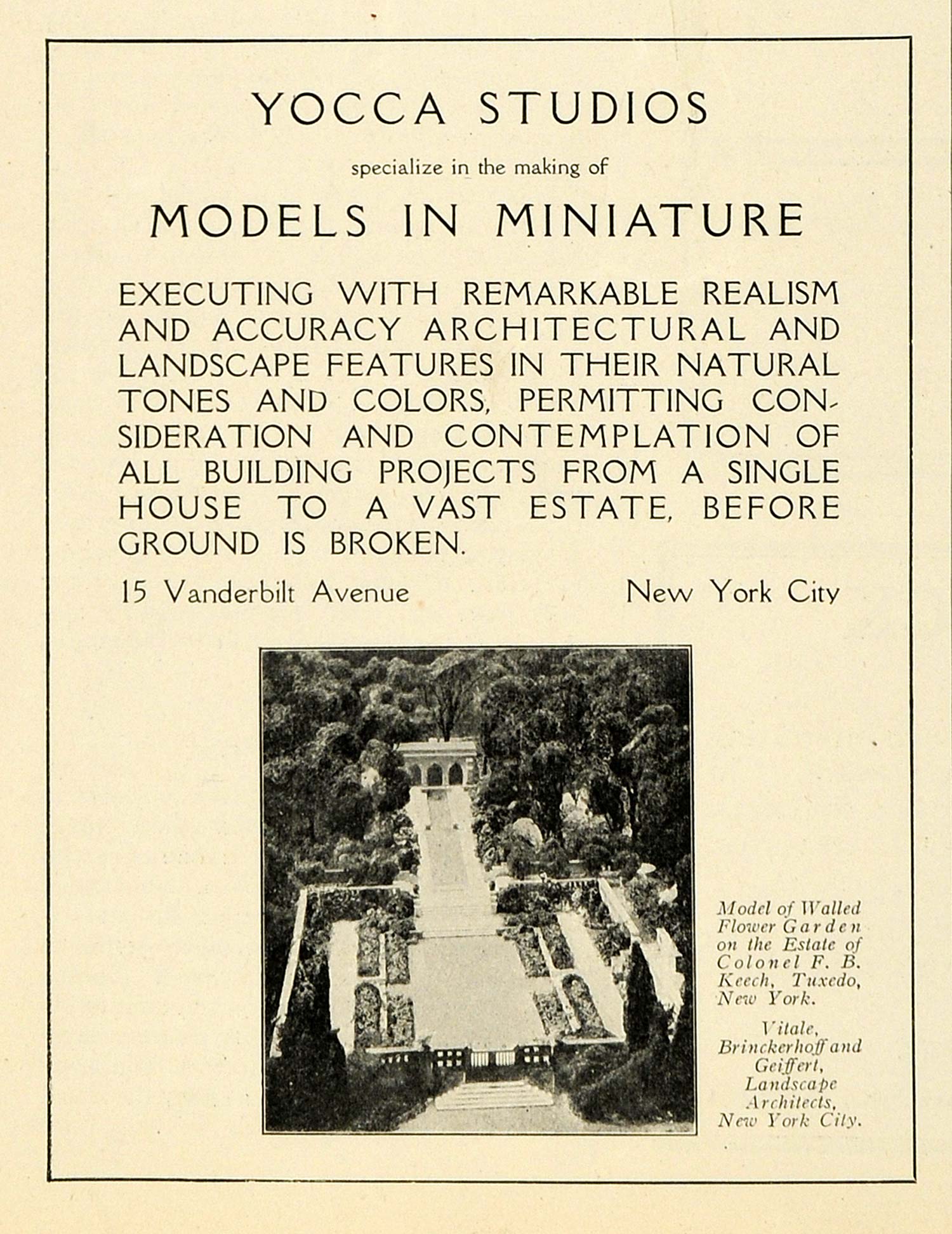 This is an original 1920 black and white print ad promoting miniature models from Yocca Studios located at 15 Vanderbilt Avenue, New York City. This ad features a model of Walled Flower Garden on the Estate of Colonel F. B. Keech, Tuxedo, New York. Landscapes Architects: Vitale, Brinckerhoff and Geiffert, New York City.