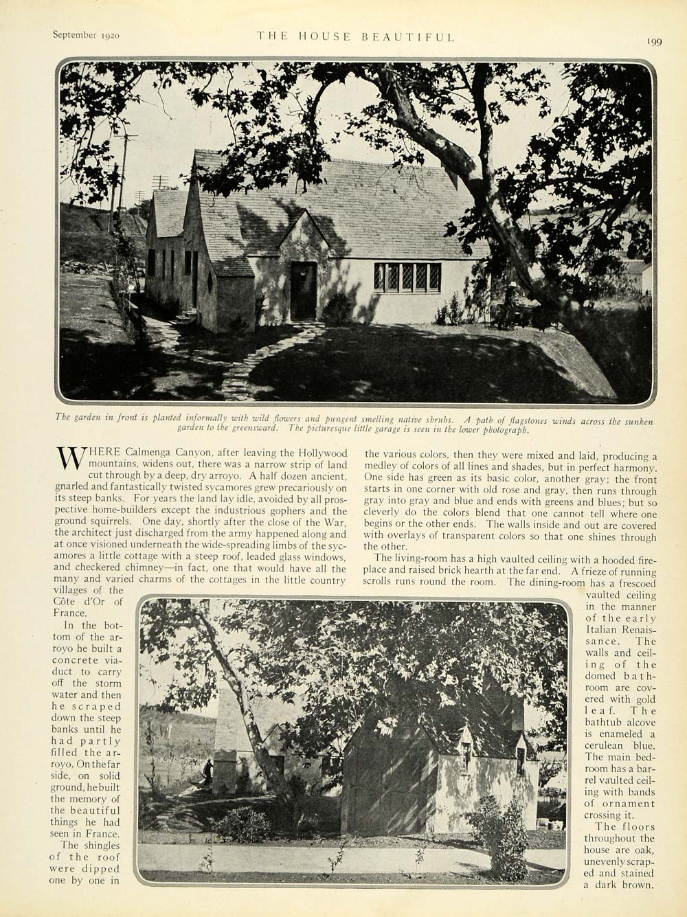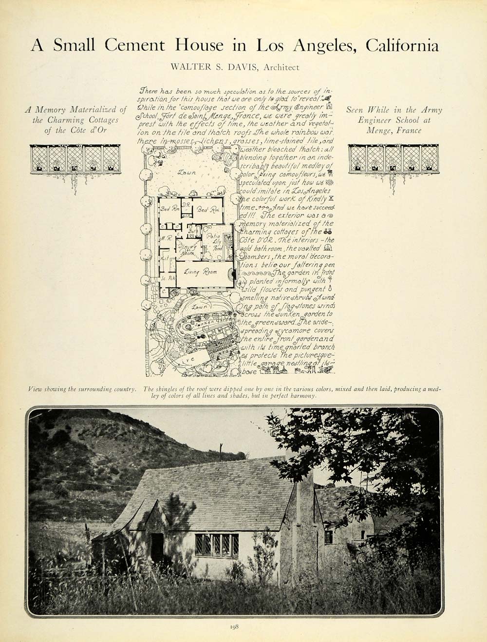 This is an original 1920 two-page article (two single-sided pages) of a charming cement house in Los Angeles, featuring architecture by Walter S. Davis. Please see additional image.