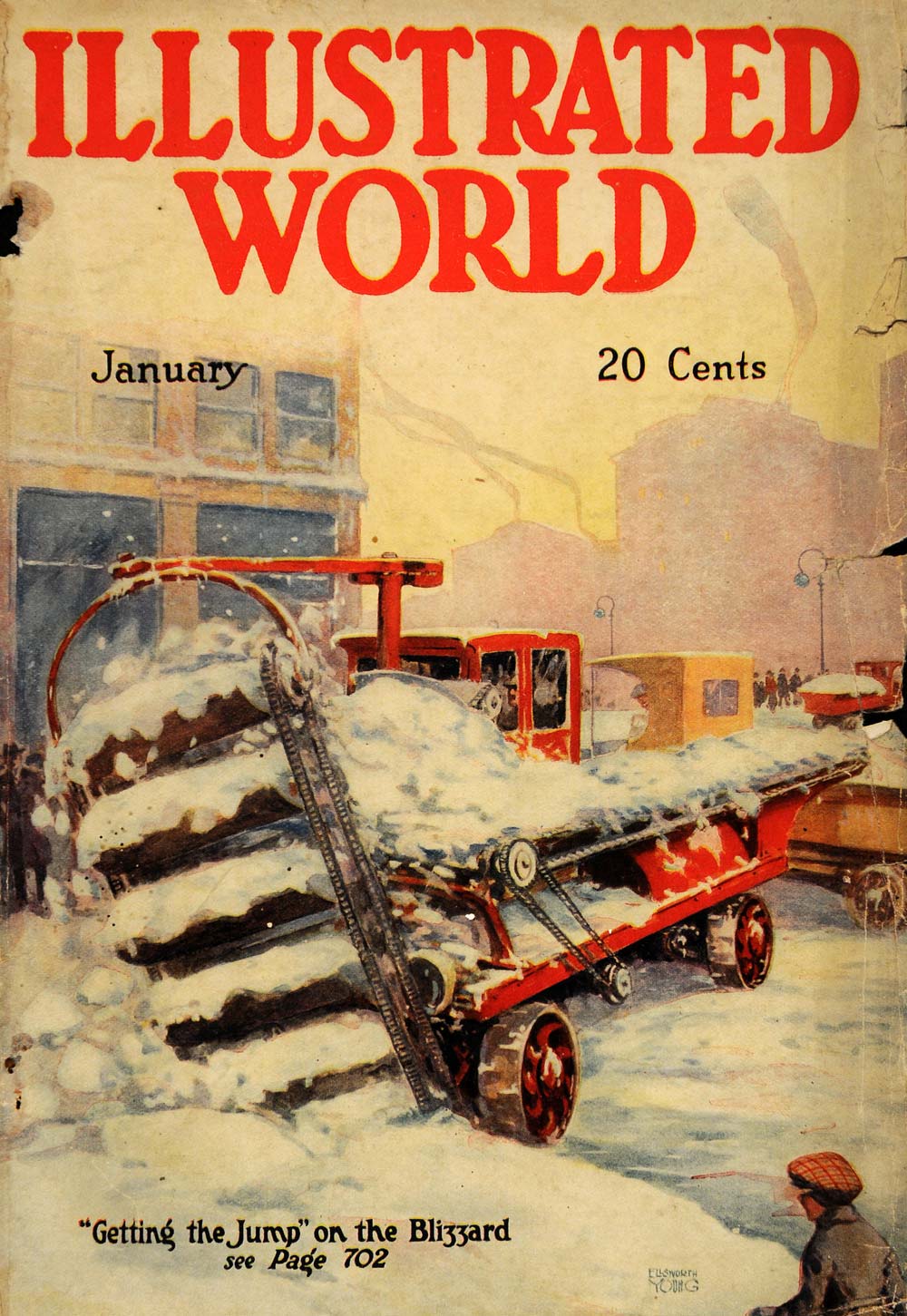This is an original 1920 color cover for Illustrated World. The caption says, "Getting the Jump on the Blizzard".