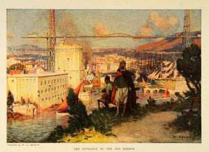 This is an original 1920 color print of a painting of the harbor of Marseille, France.