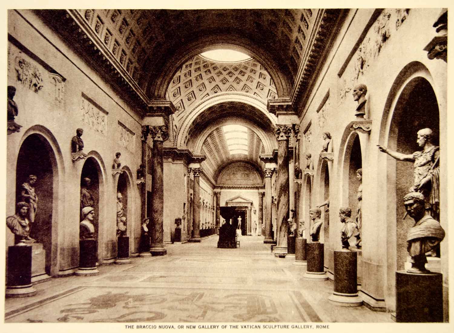 This is an original 1920 sepia photogravure of the statues lining the Braccio Nuova or New Gallery in the Vatican. Please note that there is a brief descriptive text on the reverse.