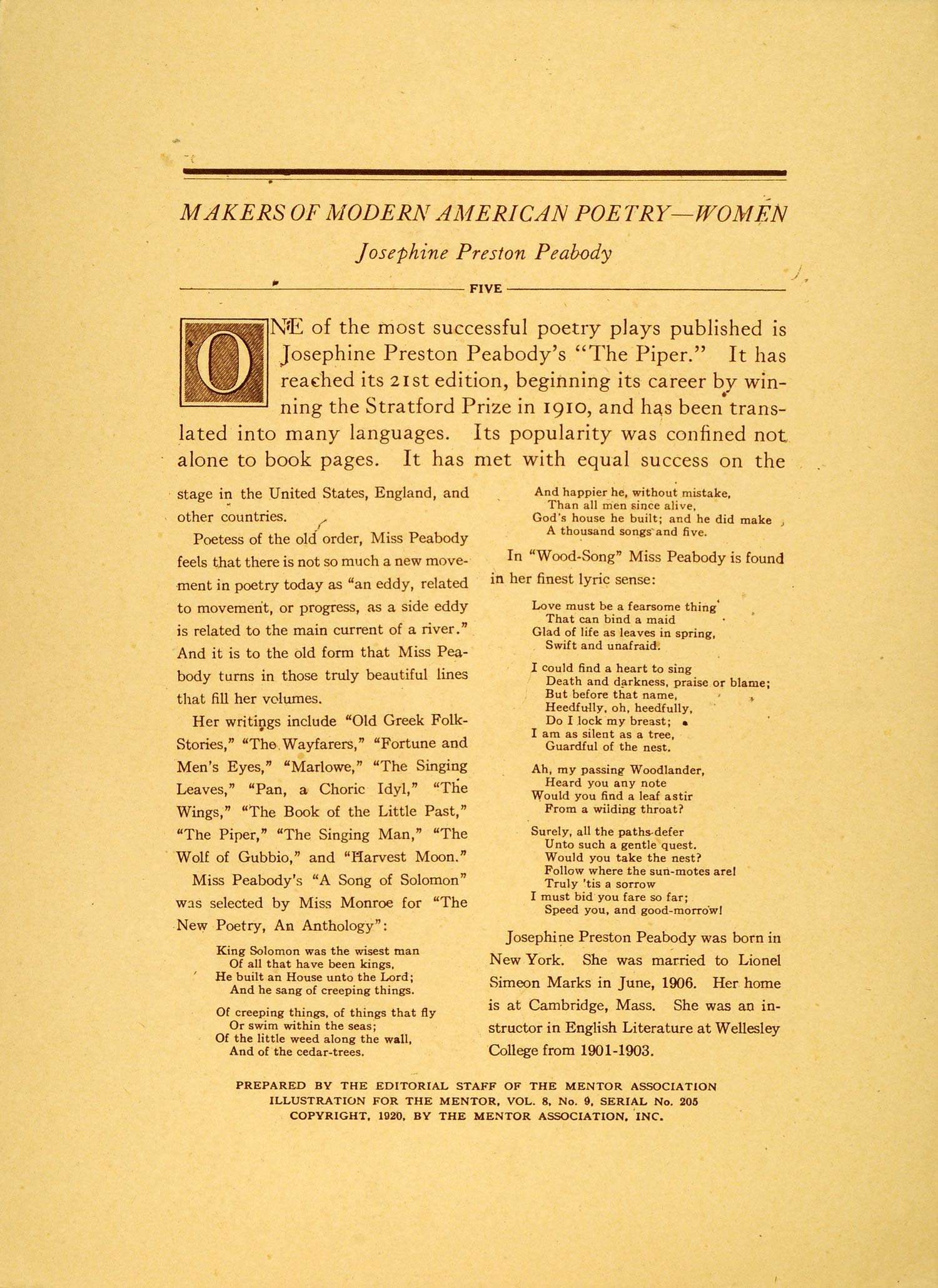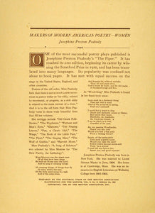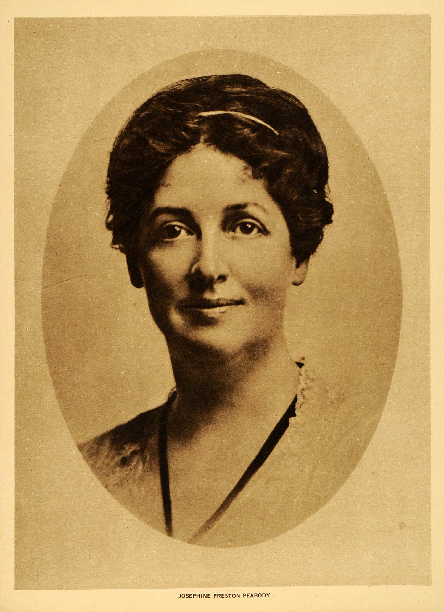 This is an original 1920 photogravure portrait of American poet and playwright, Josephine Preston Peabody (1874-1922), with a short biographical sketch on the reverse. Her writings include: The Piper, The Wayfarers: A Book of Verse, Fortune and Men's Eyes, The Wings, The Book of the Little Past, and The Wolf of Gubbio. Please see both images.