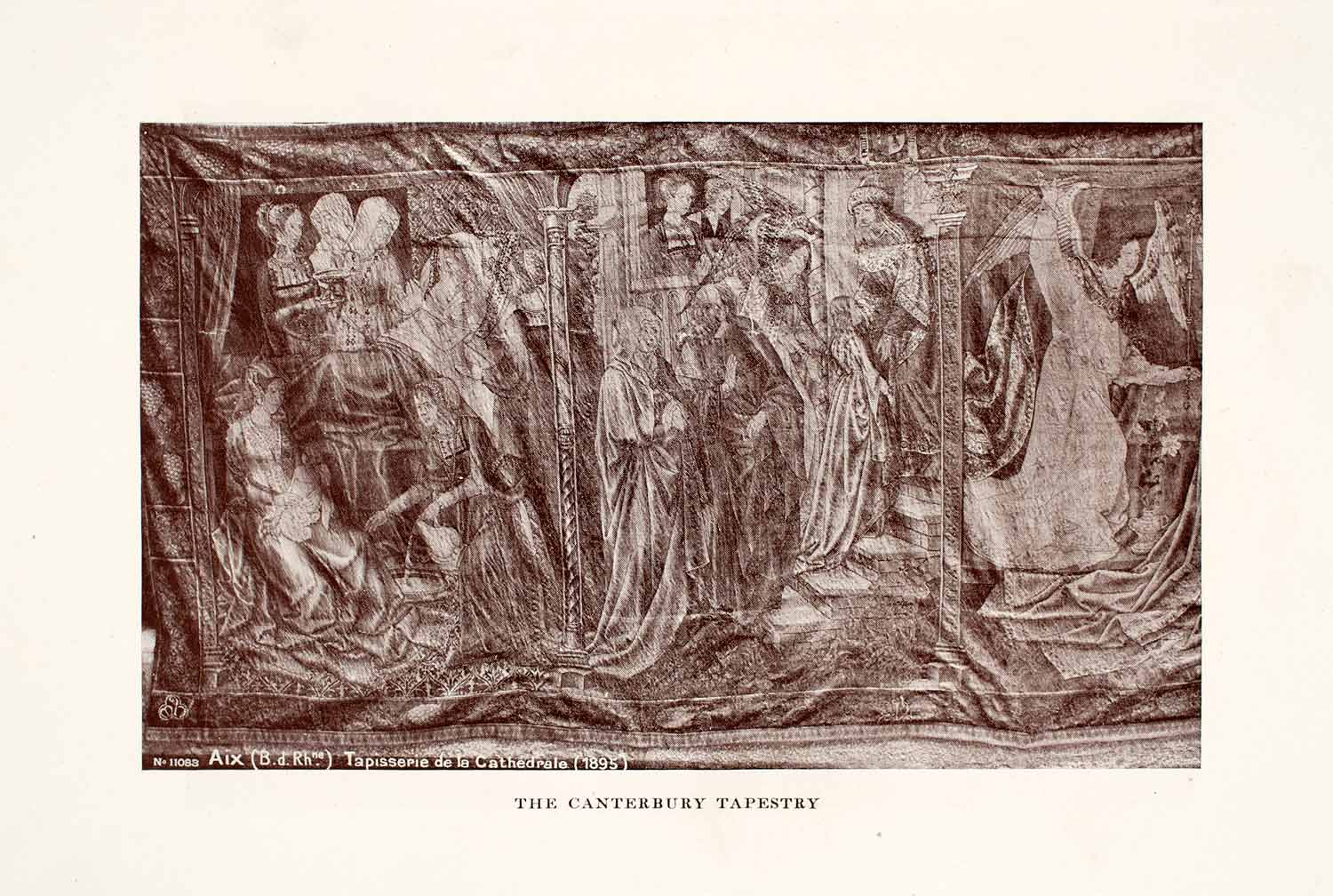 This is an original 1920 sepia halftone print which depicts one of the intricate tapestries brought to Aix Catherdal from Canterbury after the English Civil War in the 17th century. There were twenty-six in total, all of which were stolen during the French Revolution but eventually recovered by the Archbishop. Despite all that hard work, nine of them were stolen again in 1977, and have never been found.