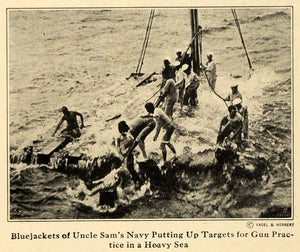 This is an original 1920 halftone print of Navy men putting up gun practice targets in the sea. Navy men were often swept away with large waves, so it was pertinent for them to be proficient swimmers.
