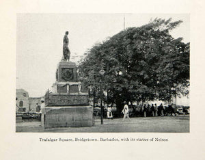 This is an original 1920 black and white halftone print of the statue of Admiral Lord Nelson in Trafalgar Square, which is located in Bridgetown, Barbados. Renamed to "National Heroes Square", the plaza is home to numerous memorials. Admiral Lord Nelson himself is famous for his brilliant naval strategies and victories for the British Empire against the Spanish and French.