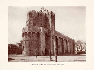 This is an original 1920 sepia halftone print of the incredible fortress church of Saintes-Maries in Carmague, France. It was supposedly one of the first sights which the Three Marys (Mary Salome, Mary Magdalene, and Mary Jacobe) saw upon arriving in Gaul from the Middle East. An interesting fact about the town of Sainte-Maries is that it serves as the center of a yearly pilgrimage which the Roma (Gypsy) people make to honor Saint Sarah, who was supposedly the dark-skinned servant of the Three Marys and is now their patron saint.