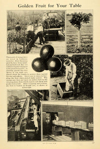 This is an original 1920 halftone print showing the process of oranges. Shown are the trees growing, followed by the fruits being harvested, sorted, and packaged.