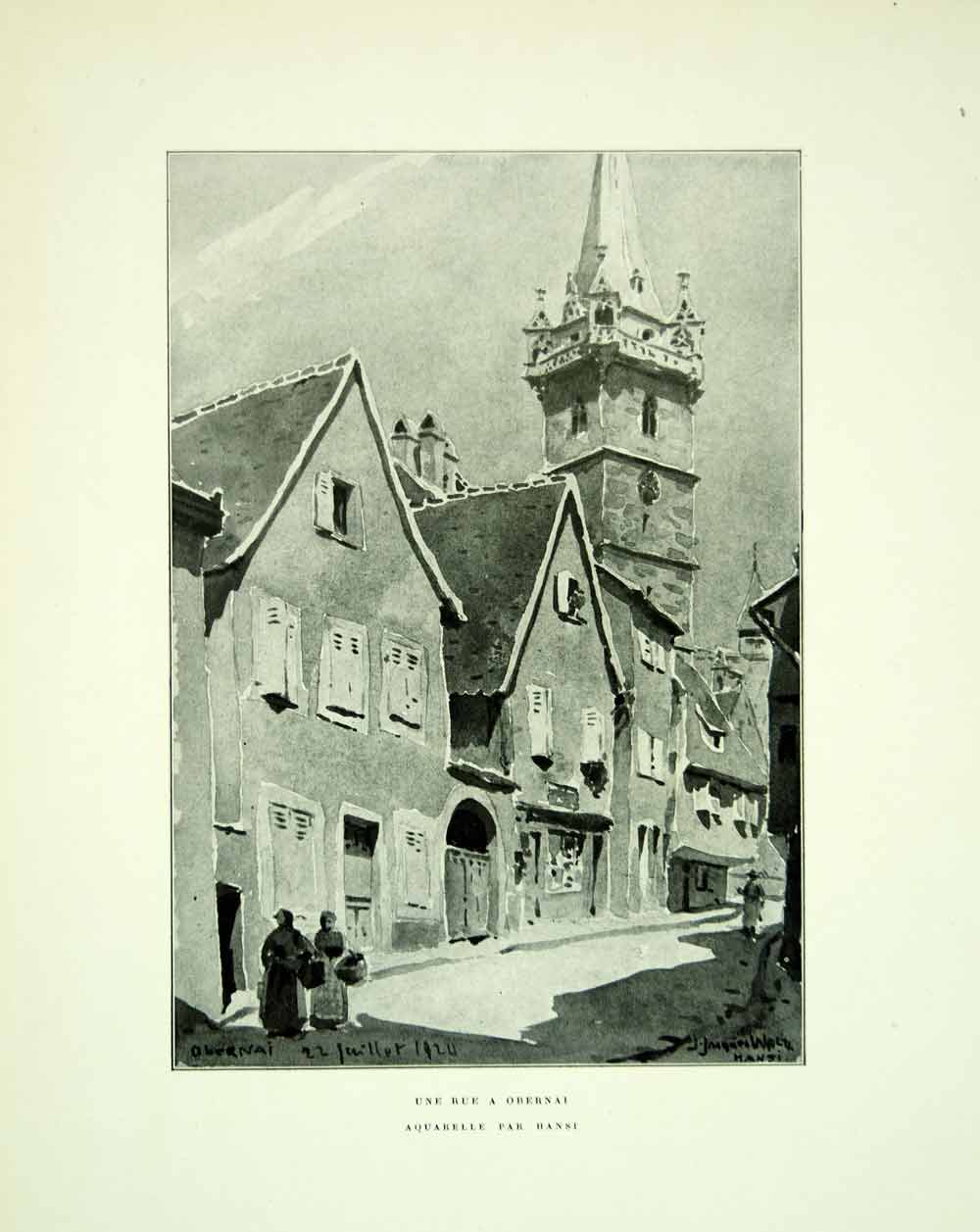 This is an original 1920 black and white halftone print of a street scene in Obernai, France by Jean-Jacques Waltz also known as Hansi or Oncle Hansi.