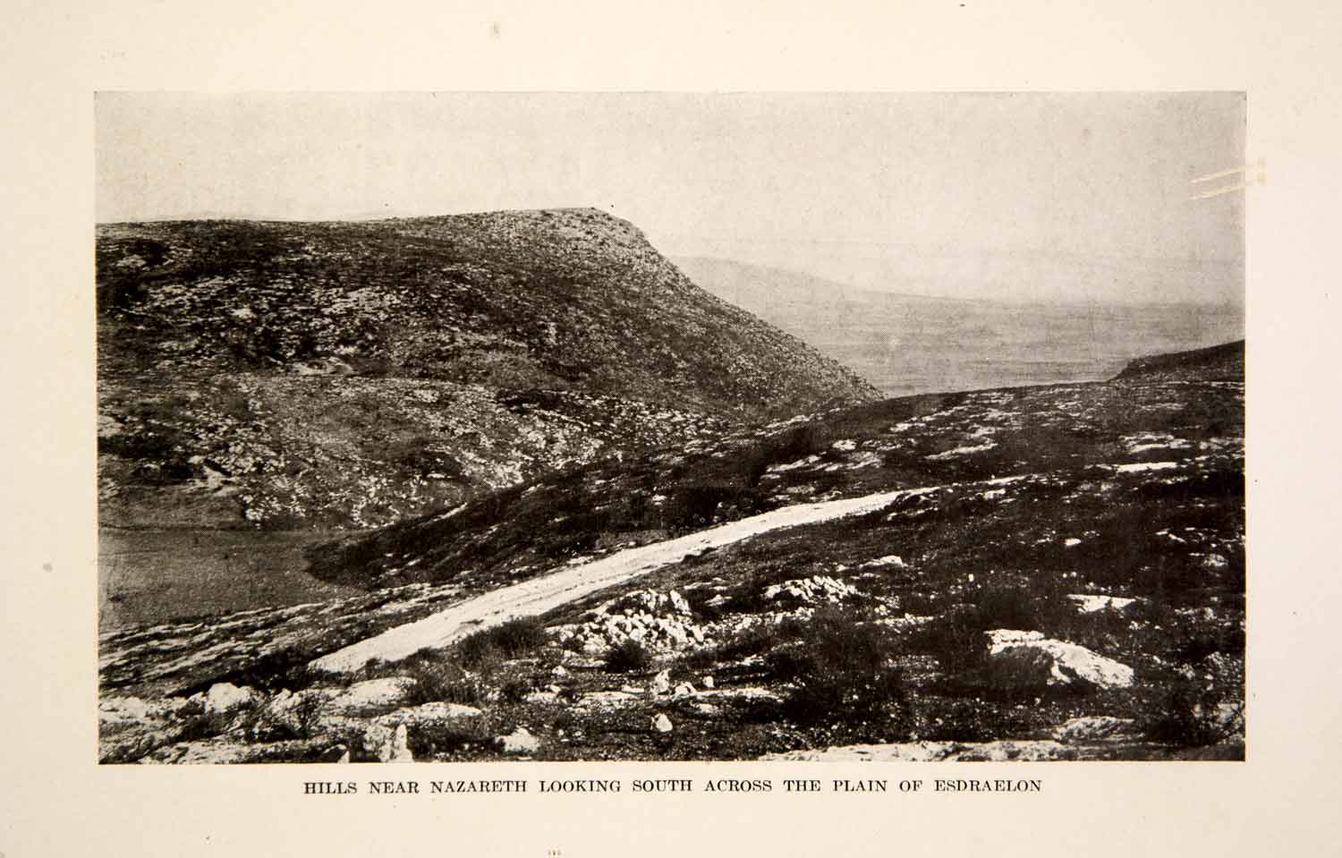 This is an original 1920 black and white halftone print of the hills near Nazareth, looking south across the Plain of Esdraelon.