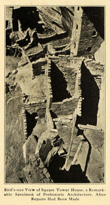 This is an original 1920 halftone print of the Square Tower House of Mesa Verde National Park in Mesa Verde, Colorado. Shown is the prehistoric cliff dwelling after work had been done on it.