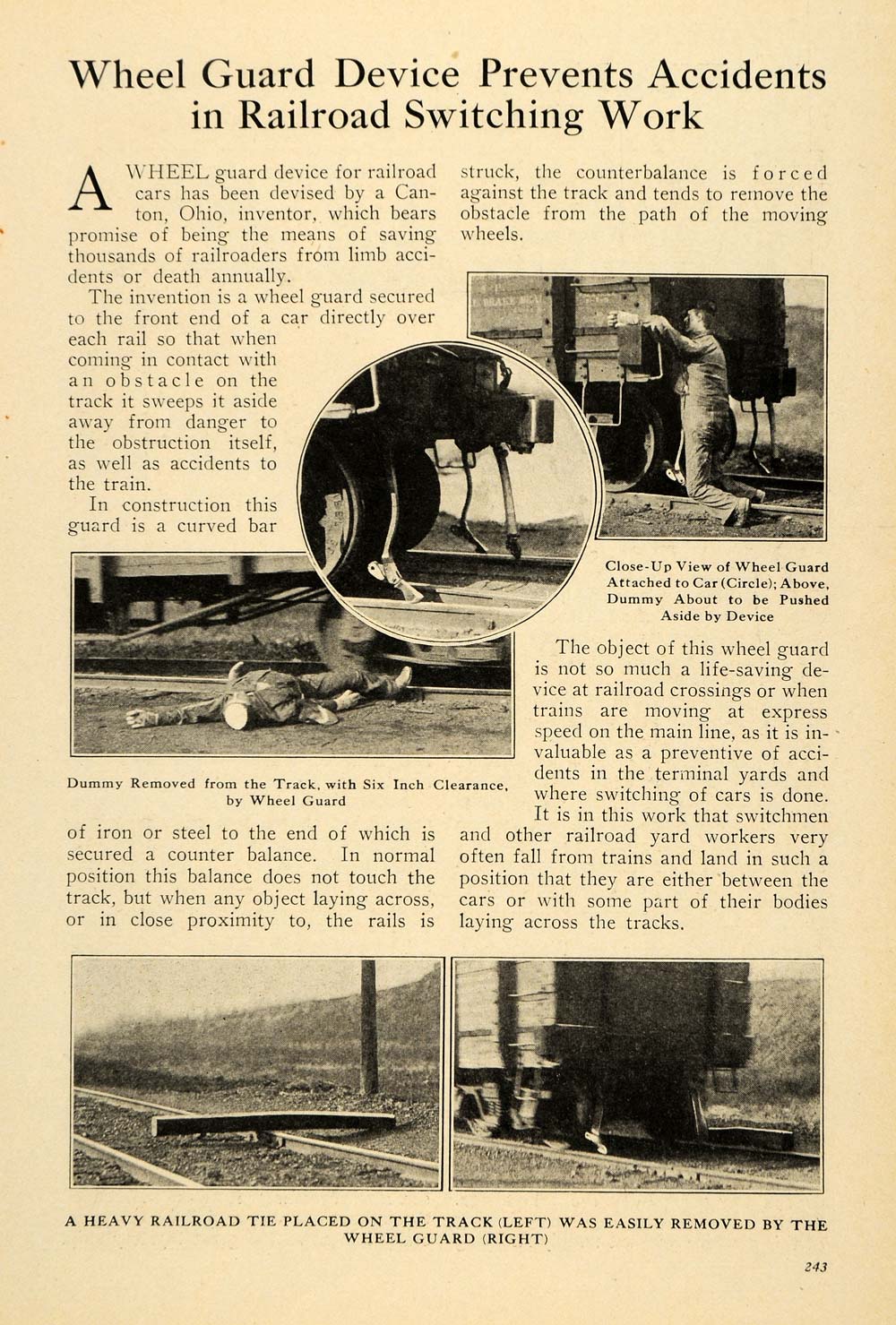 This is an original 1920 halftone print showing how a railroad switch guard device works to prevent accidents from happening on the tracks.