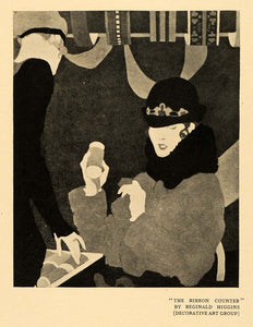 This is an original 1920 halftone print of The Ribbon Counter by Reginald Higgins. This is a very interesting piece that shows a women counting and looking at ribbons. The style used her is intriguing and draws the viewer into the piece.