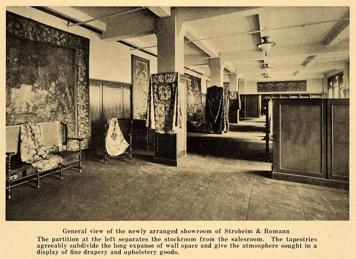 This is an original 1920 halftone print of a showroom fabrics display at Stroheim & Romann, makers of upholstery fabrics.