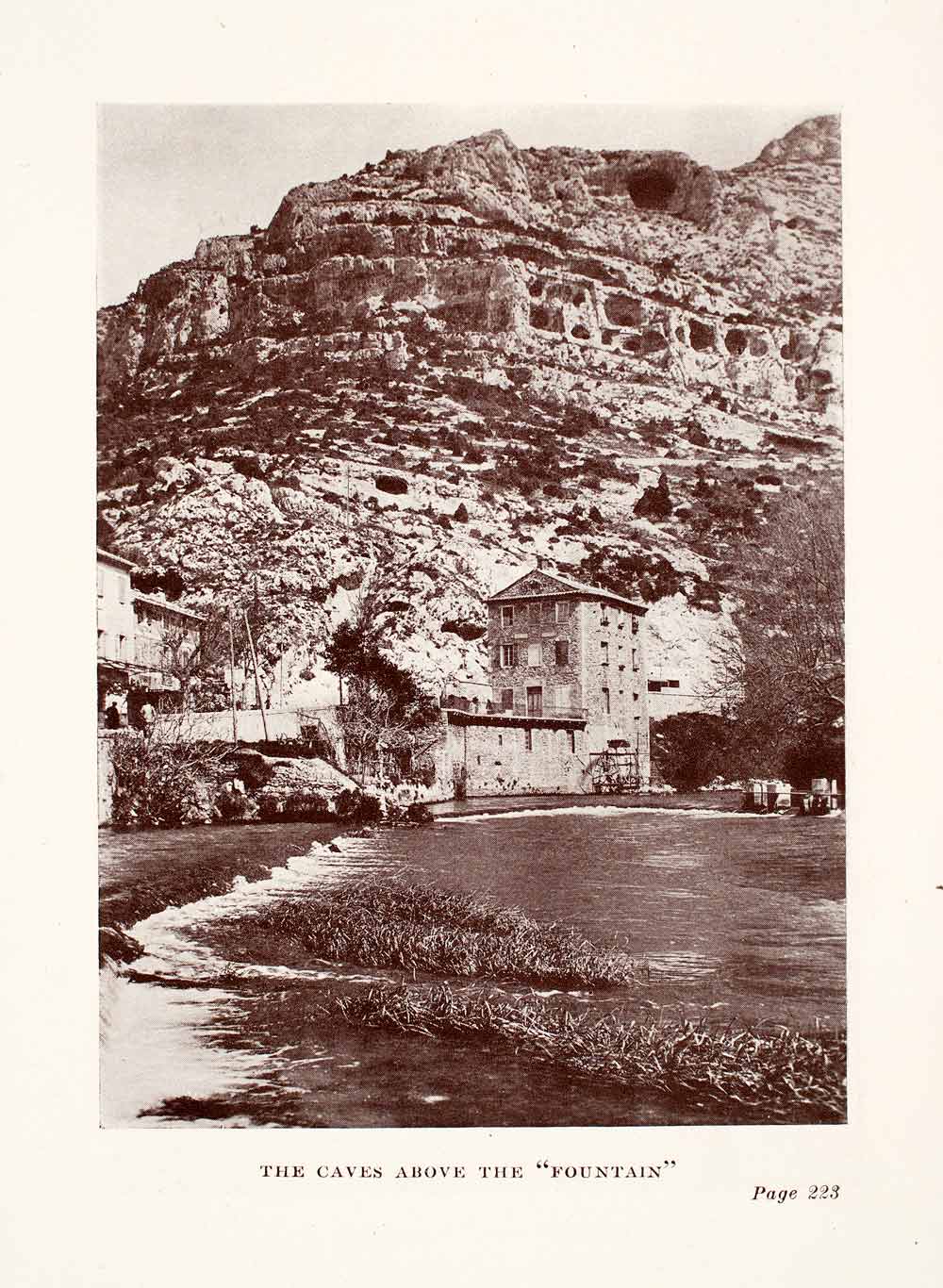 This is an original 1920 sepia halftone print depicting some of the incredible natural history surrounding Fontaine-de-Vauclause. It is here that the fifth largest spring in the world rises up at the base of the Alpine hills and becomes the river Sorgue. The poet Petrarch was known to have visited this area often, to listen to the flow of the river and draw inspiration.