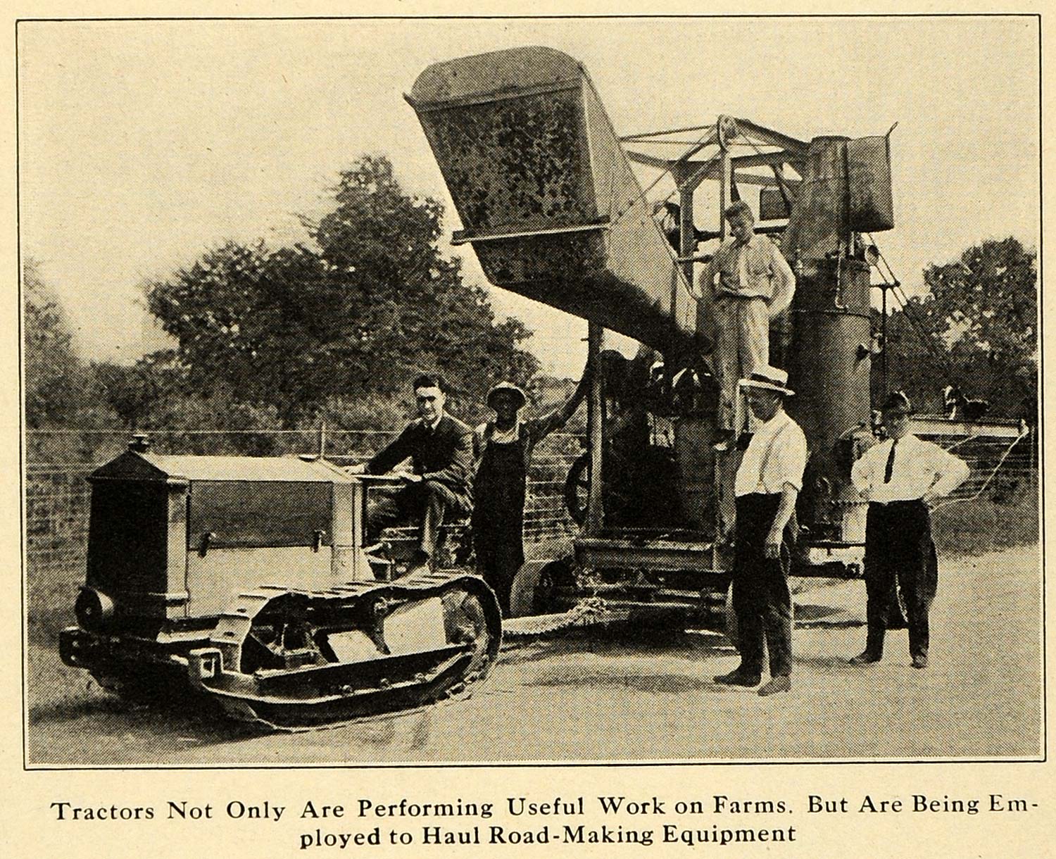 This is an original 1920 halftone print. The caption reads, "tractors not only are performing useful work on farms, but are being employed to haul road-making equipment."