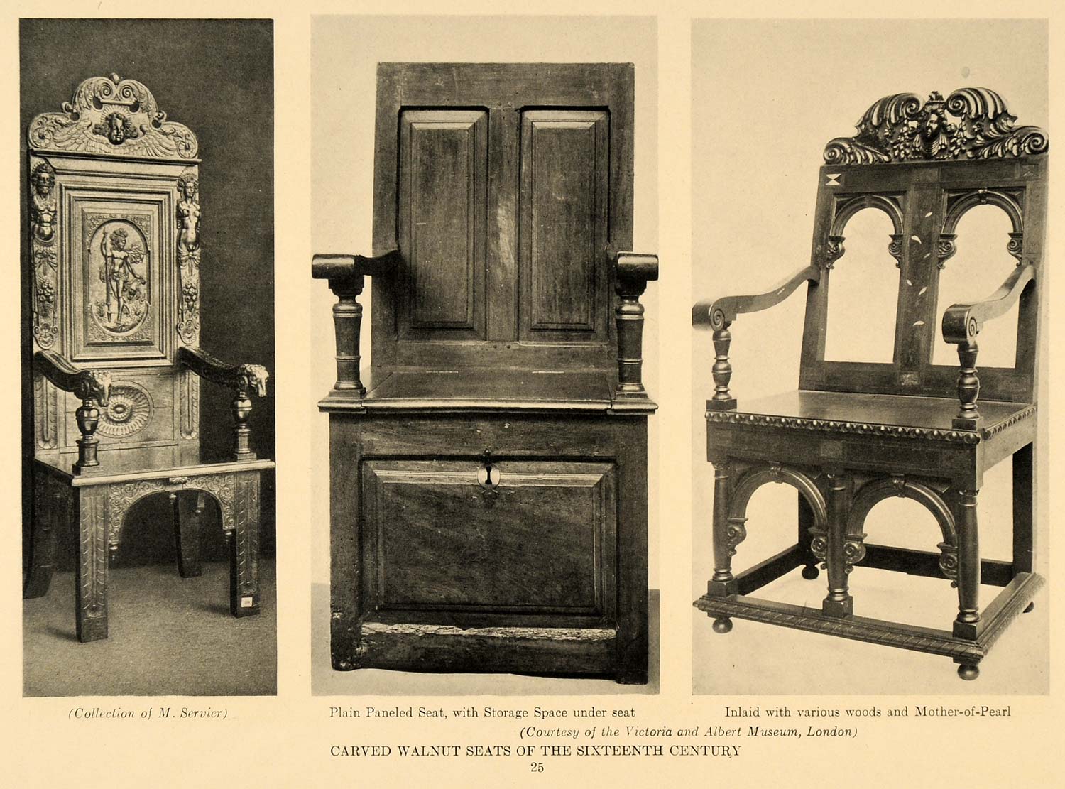 This is an original 1920 black and white halftone prints for Carved Walnut Seats of the Sixteenth Century. Pictures are courtesy of the Victoria and Albert Museum in London and include a wooden seat from the collection of M. Servier, a Plain Paneled Seat with Storage Space under seat, and a wooden seat inlaid with various woods and Mother-of-Pearl.