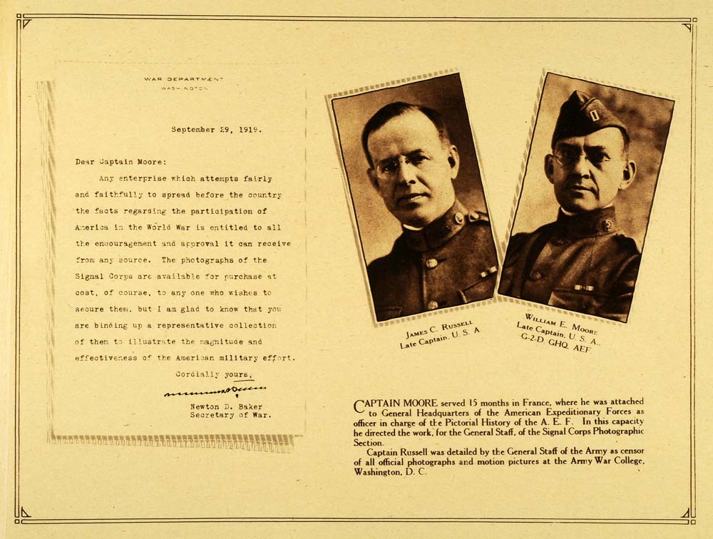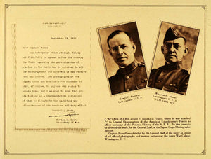 This is an original 1920 World War I sepia rotogravure of Captains James C. Russell and William E. Moore, featuring a letter to Captain Moore from Secretary of War, Newton D. Baker.