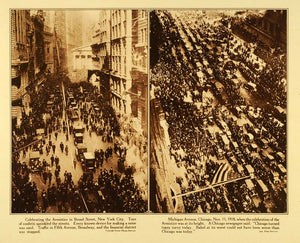 This is an original 1920 World War I sepia Rotogravure of the crowds of people flooding the streets of Broad Street in New York City and Michigan Avenue in Chicago.