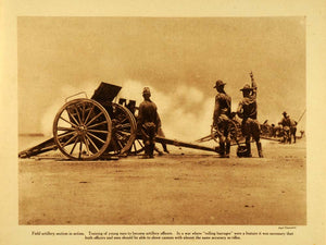This is an original 1920 World War I sepia rotogravure of artillery officers practicing their cannon target practice against rolling barrages.