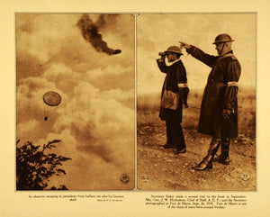 This is an original 1920 World War I sepia rotogravure of a parachuter escaping from an observation dirigible balloon after it was struck and set afire by German enemy shell fire. The second image shows Secretary of War Newton Baker with Chief of Staff Major General J. W. McAndrew at Fort de Marre, near Verdun.
