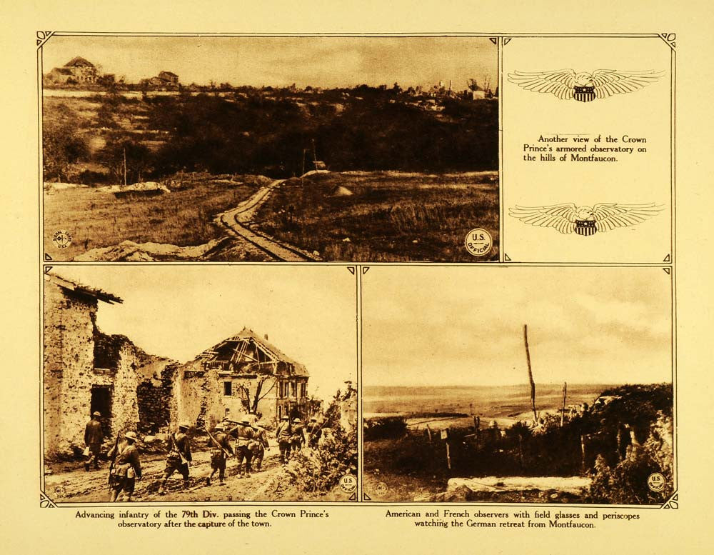 This is an original 1920 World War I sepia rotogravure of a view of the Crown Prince's armored observatory in Montfaucon. The second image shows the advancing infantry of the 79th division as they pass Kaiser Wilhelm II's observatory after the town's capture. The final image shows American and French observers with field glasses and periscopes watching the Germans retreat from the area.
