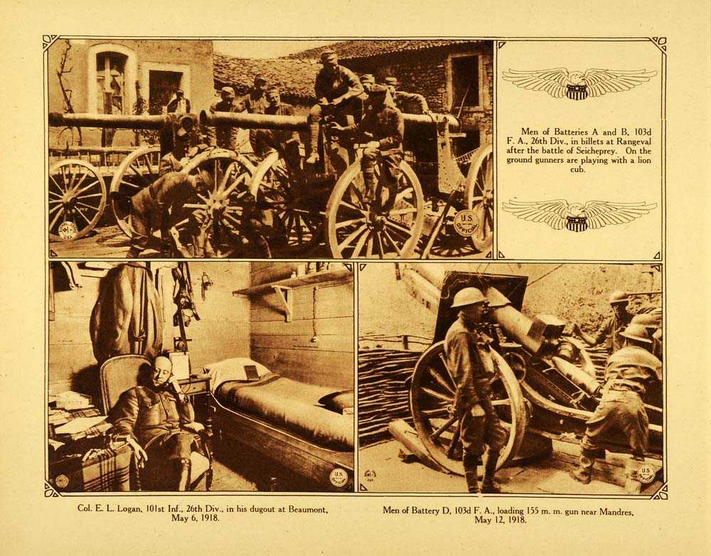 This is an original 1920 World War I sepia rotogravure of the men of Battery A and Battery B of the 103rd Field Artillery, 26th Division in billets (assigned sleeping quarters) at Rangeval after the battle of Seicheprey. On the ground gunners are playing with a lion cub. The second image shows Colonel E. L. Logan of the 101st Infantry, 26th Division in his dugout at Beaumont. The final image shows the men of Battery D, 103rd Field Artillery, loading a 155 m. m. gun near Mandres.