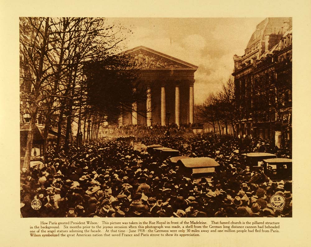 This is an original 1920 World War I sepia Rotogravure of Paris natives flooding the streets to get a glimpse of President Wilson. The crowds gathered in front of the famed Madeleine church in France.
