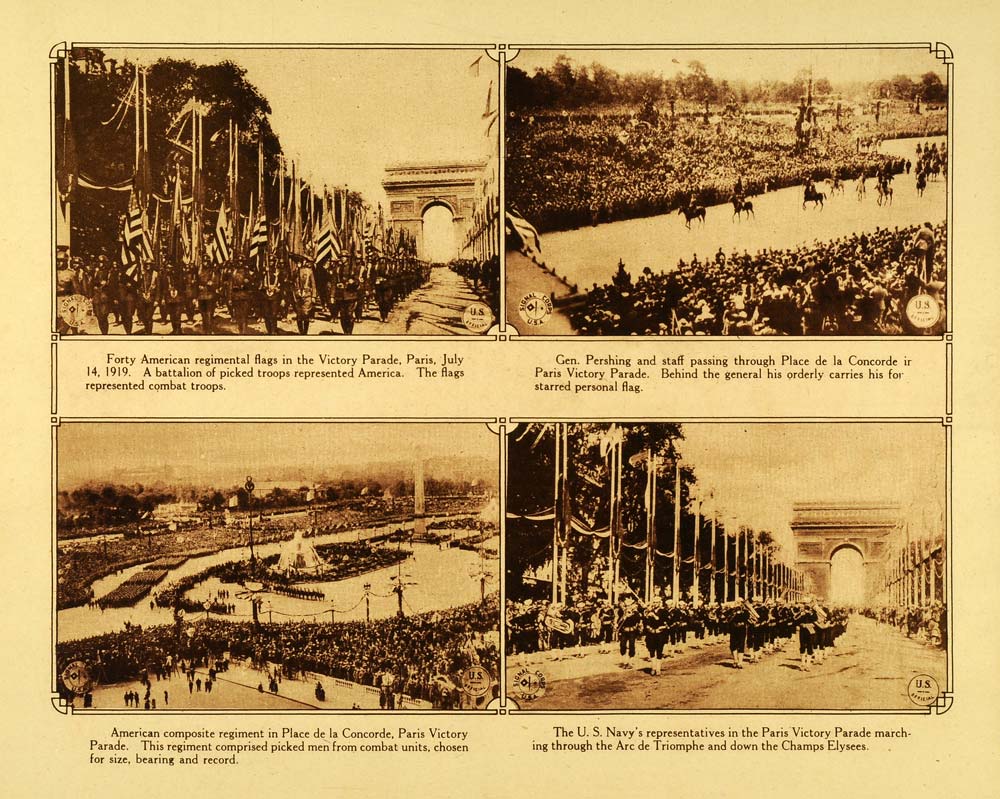 This is an original 1920 World War I sepia Rotogravure of forty American regimental flags in the Paris Victory Parade, which represented combat troops. The second image shows General Pershing and his staff passing through the Place de la Concorde in the Paris Victory Parade. The third image shows the American composite regiment in Place de la Concorde, Paris Victory Parade. The final image shows the U. S. navy's representatives in the Paris Victory Parade marching through the Arc de Triomphe and down the Champs Elysees.