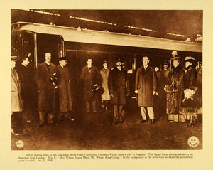 This is an original 1920 World War I sepia Rotogravure of President and Mrs. Woodrow Wilson in London, England prior to departing to France for the Peace Conference. Others pictured include, Queen Mary and King George. The train in the background is the one on which the presidential party traveled.