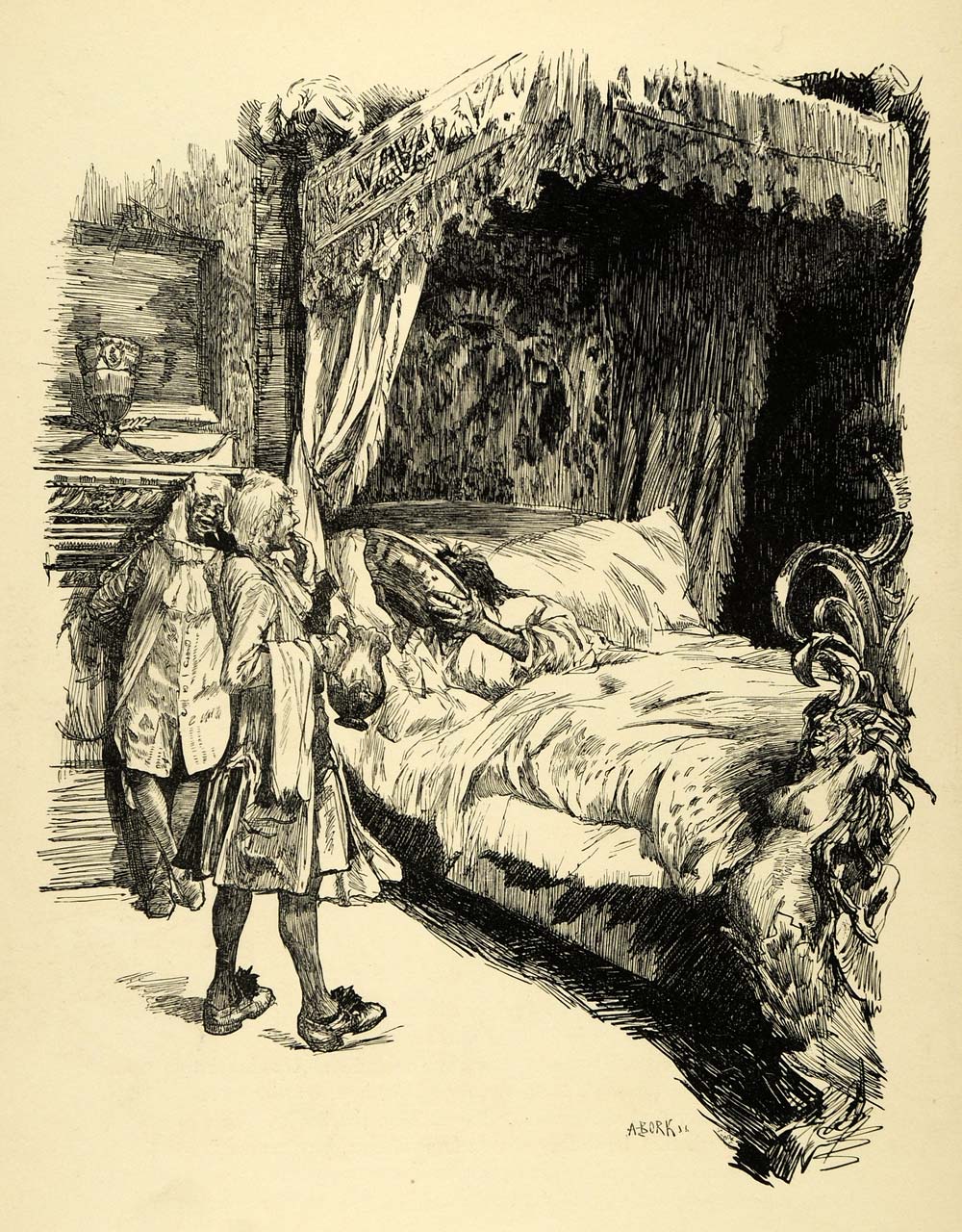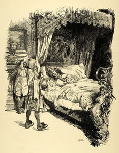 This is an original 1920 black and white wood engraving of what appears to be a sick royal subject being laughed at by his servants. The original wood engraving was done by A. Bork.