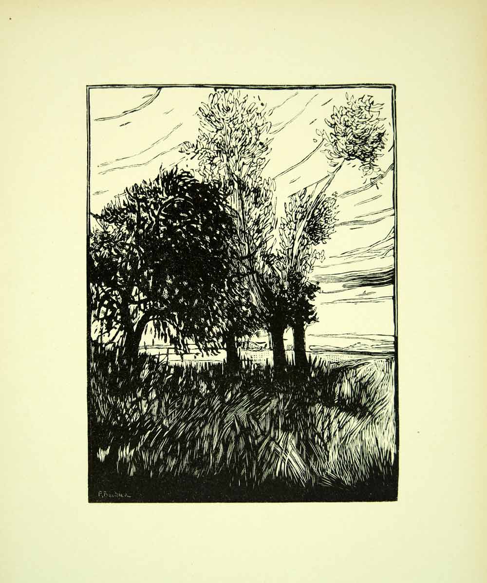 This is an original 1920 black and white engraving depicting a landscape in Loiret, France by M. Paul Baudier.