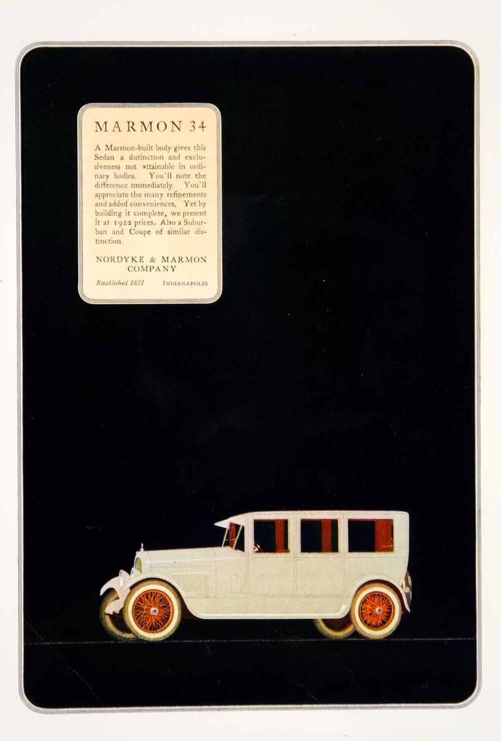 This is an original 1921 color print ad for the 1922 Marmon 34 sedans that were made and sold by the Nordyke & Marmon Company of Indianapolis, IN.