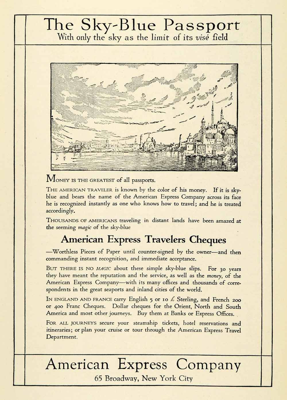 This is an original 1921 black and white print ad for the American Express Company of 65 Broadway, New York City.