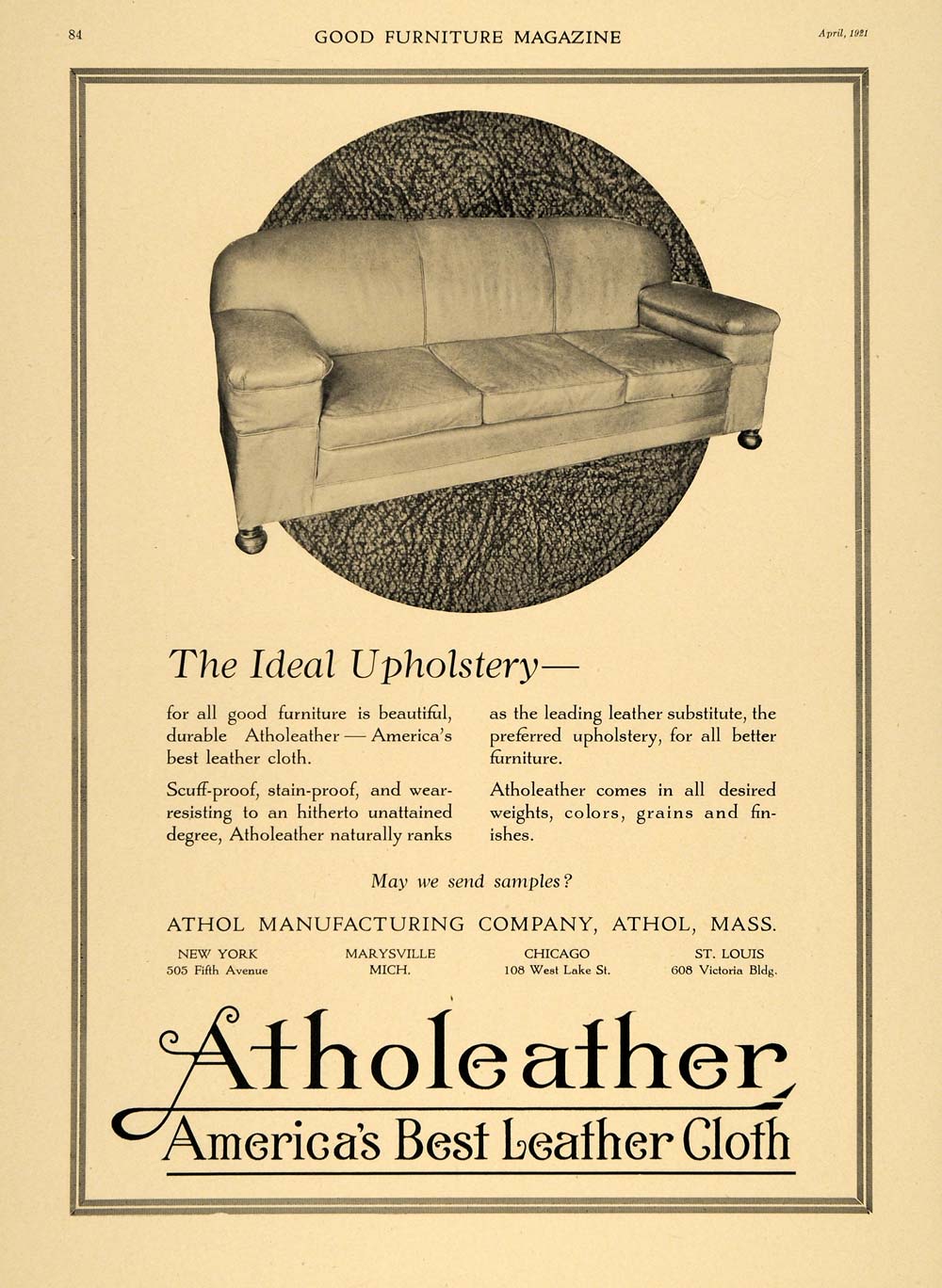 This is an original 1921 black and white print ad for the Atholeather, the best leather cloth and ideal upholstery for furniture from Atho Manufacturing Company located at Athol, Massachusetts.