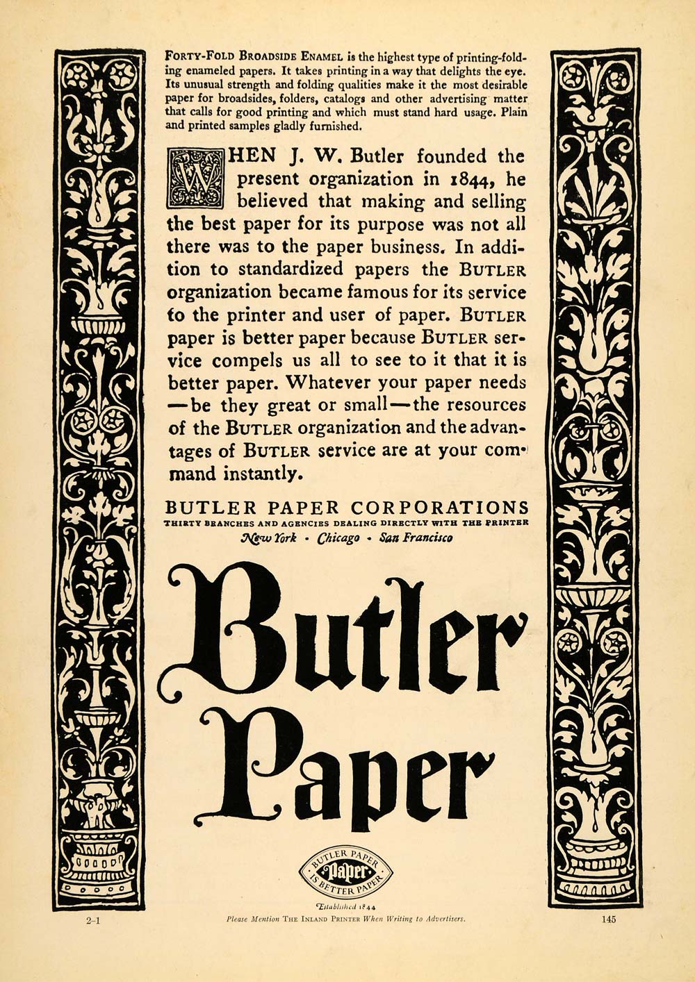 This is an original 1921 black and white print ad for the Butler printing folding enameled papers from