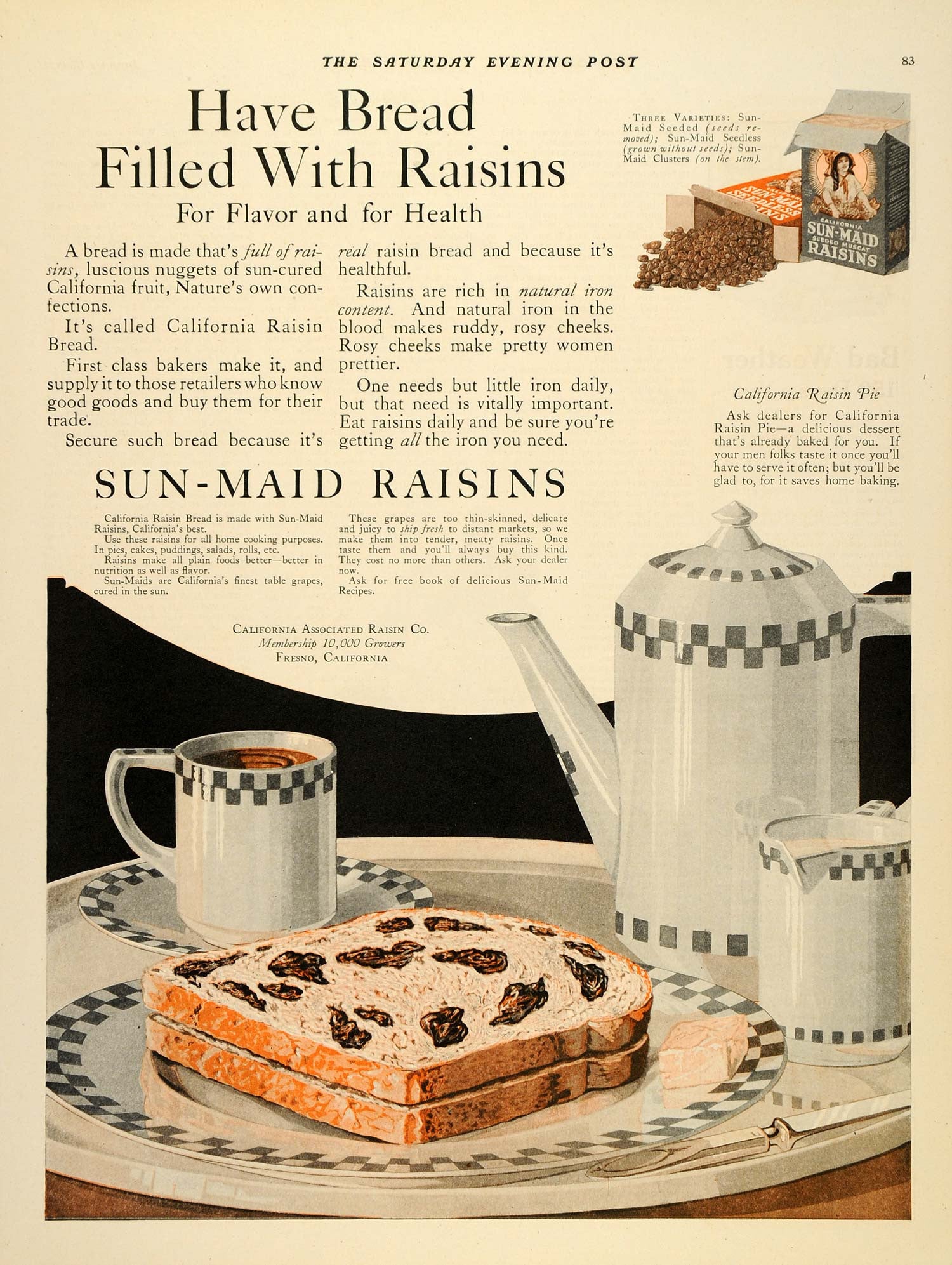 This is an original 1921 color print ad for California Sun-Maid Raisins, which boasts of its nutrition. Especially interesting about this ad is how it is marketed toward women looking to be more attractive.